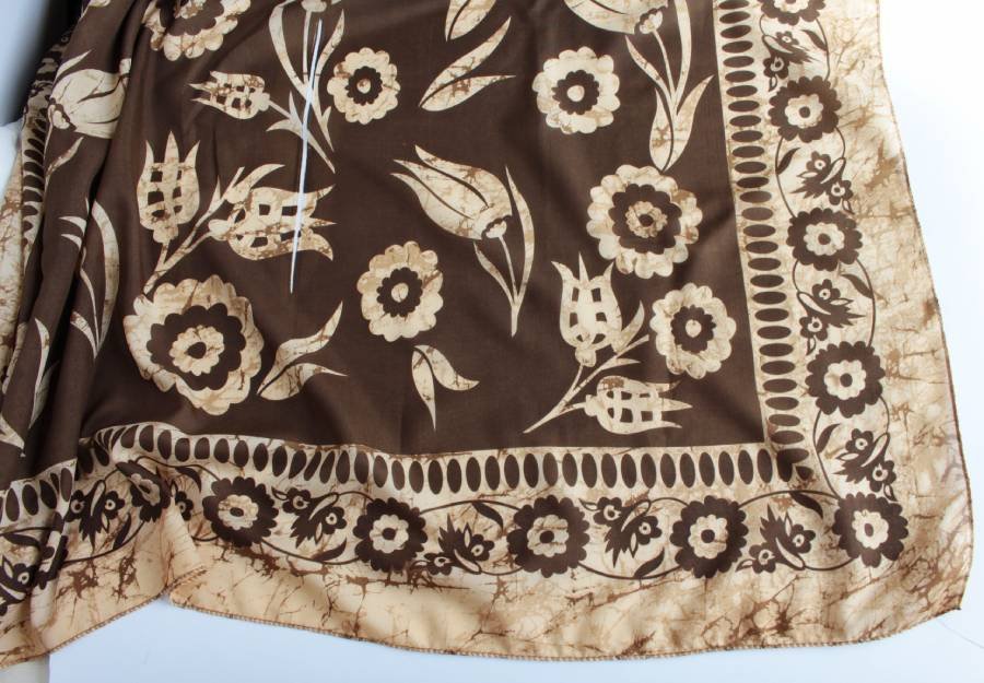 Duża chusta vintage w abstrakcyjne wzory. Brak metki ze składem - może być to wiskoza lub syntetyk (miękki materiał).