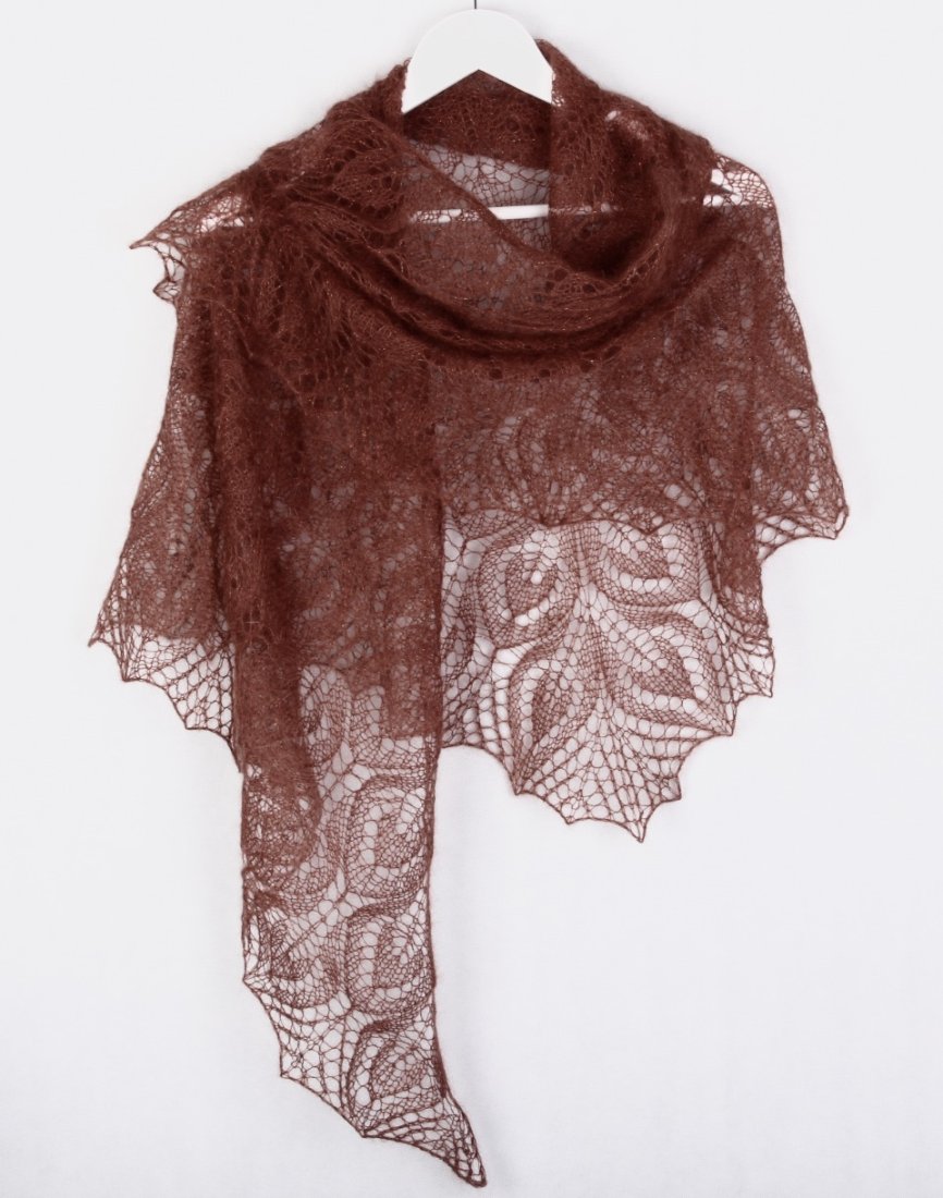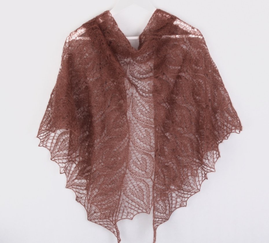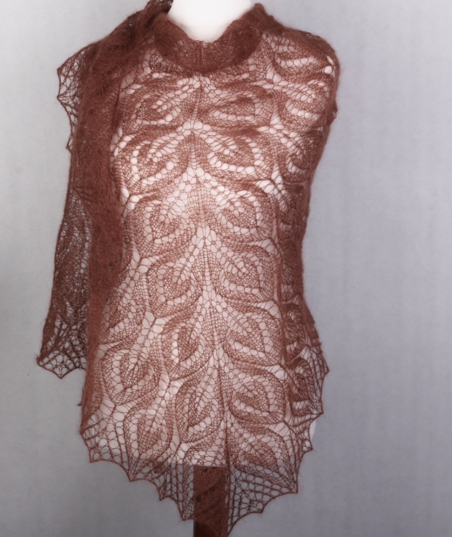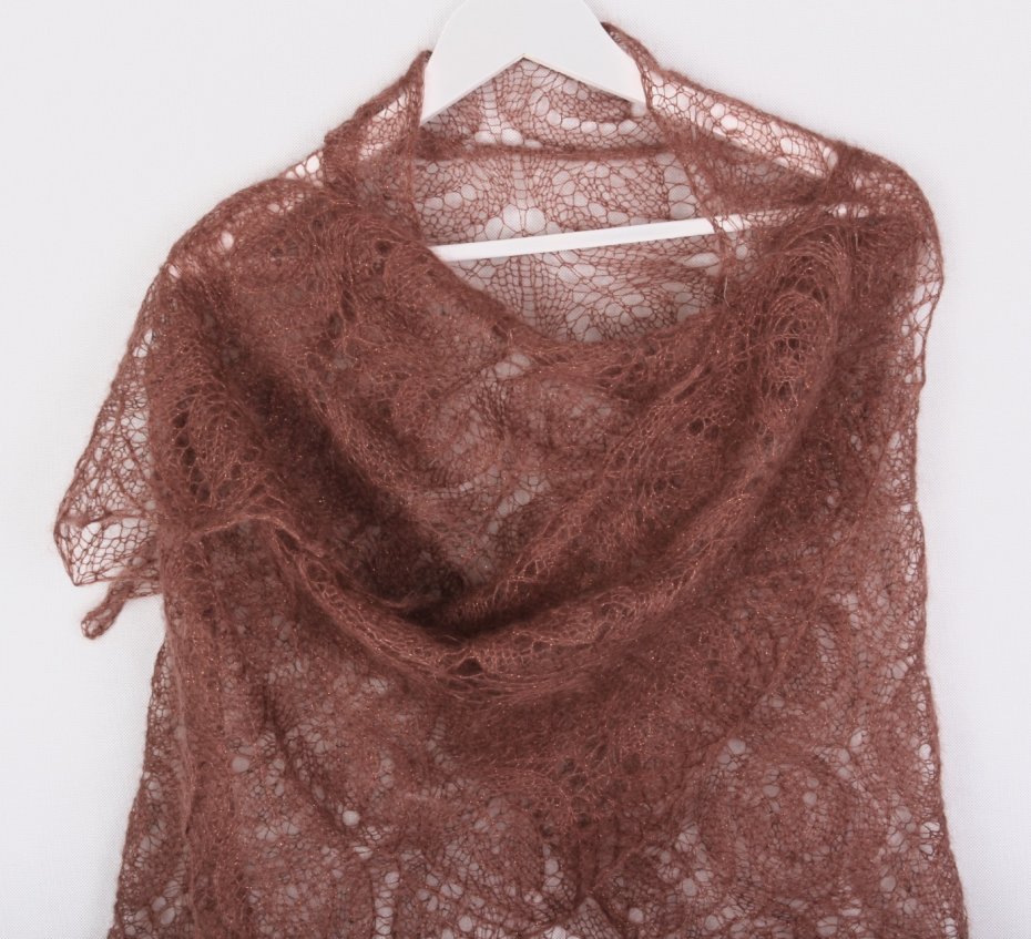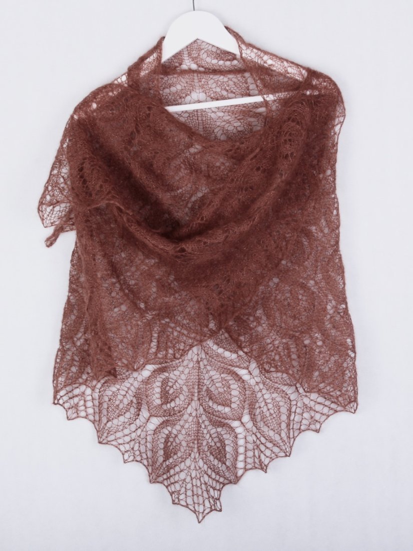 Fantastycznie miękka, delikatnie moherowa, jedwabna z subtelną złotą nitką chusta wydziergana ręcznie na drutach, jest w kolorze ładnego brązu orzechowego. Dekoracyjna, wyjątkowa, miła dla skóry, bardzo pięknie układa się na sylwetce i daje efekt delikatnej pajęczynki, mgiełki niezwykłej lekkości. Złota, lekko połyskująca nitka w delikatnym moherku daje dyskretny błysk.