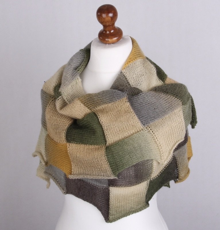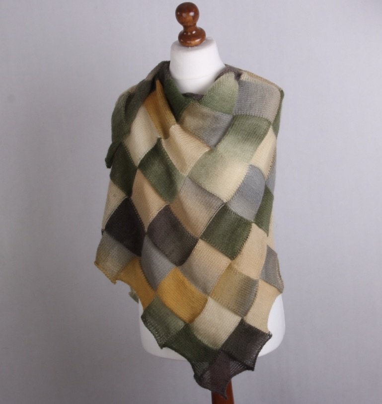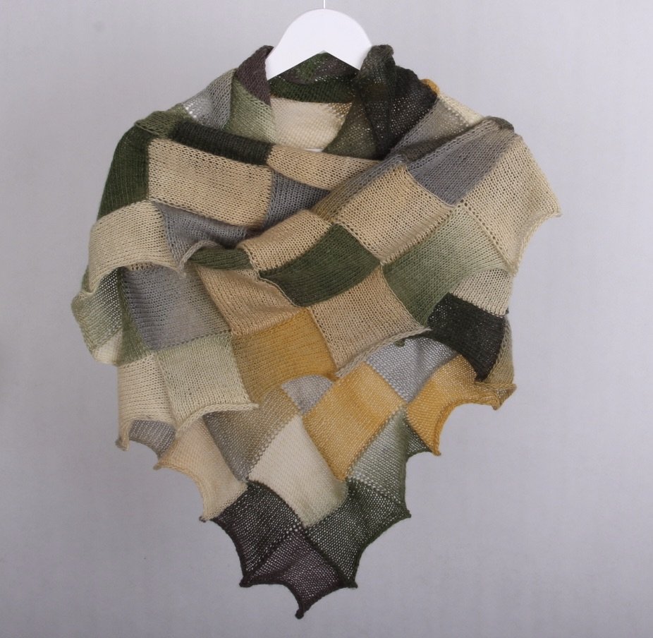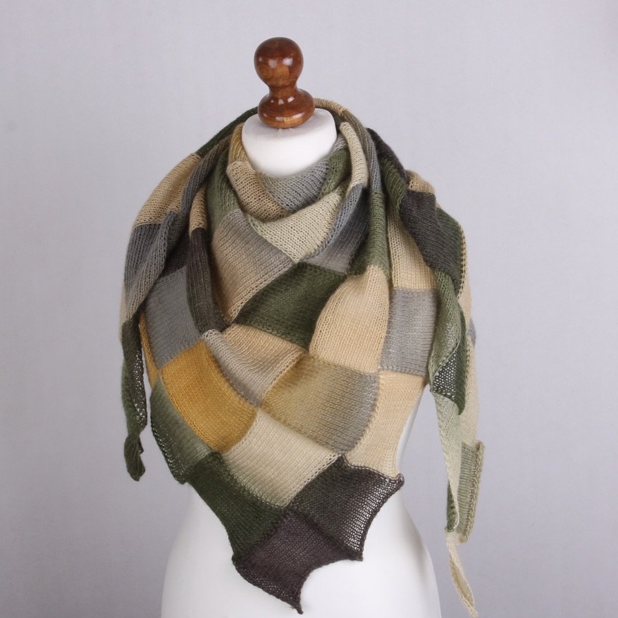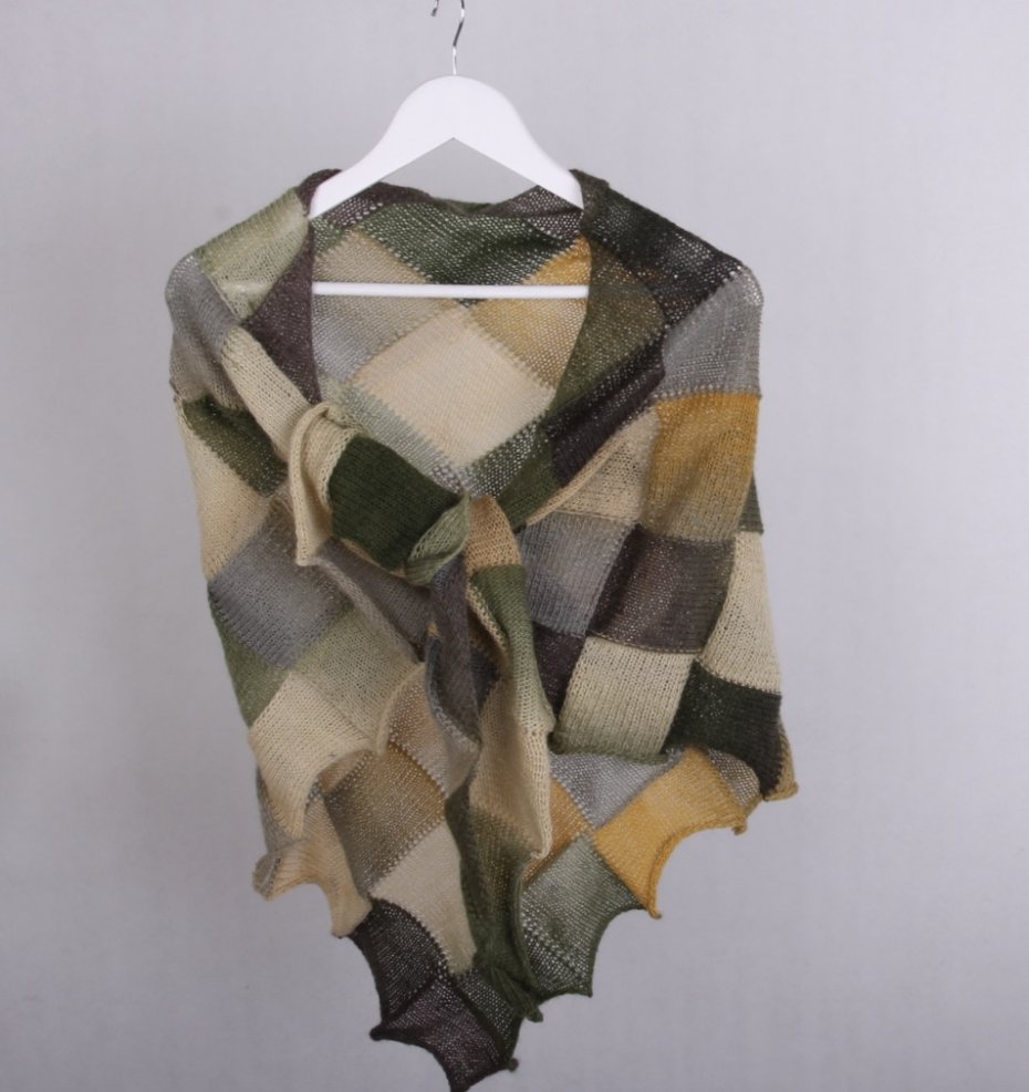 Chusta wykonana ręcznie na drutach z wełny i niewielkiej ilości nylonu. Łączy w sobie wyjątkową miękkość, delikatność i trwałość. Chusta jest bardzo ciepła, lekka i dekoracyjna, z mieszanka rożnych zieleni w połączeniu z beżami i szarością przyciąga wzrok.