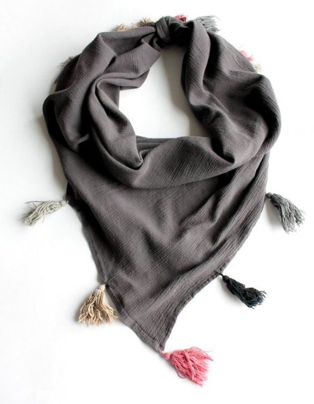Duża, miękka chusta w klasycznym odcieniu szarości, o brzegach wykończonych dekoracyjnymi, wielobarwnymi chwostami. Chusta skandynawskiej marki SAINT TROPEZ.
