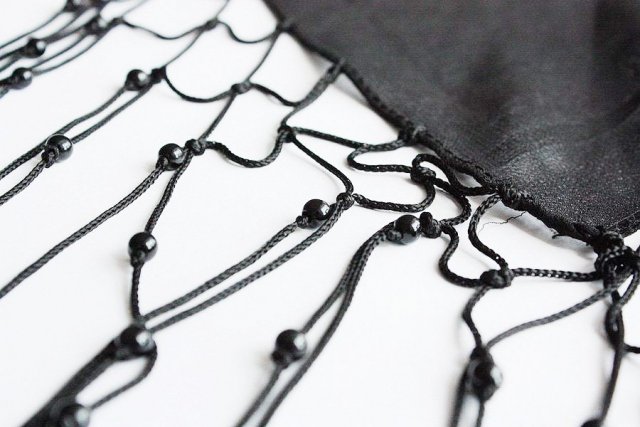 Czarna, wielka, półtransparentna chusta z długimi frędzlami oprószonymi gdzieniegdzie koralikami.