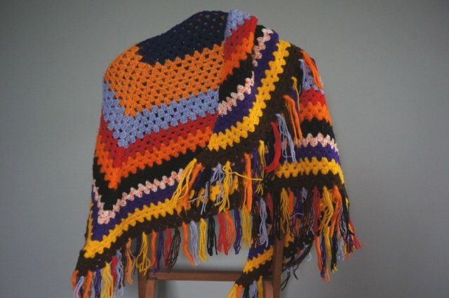 Piękna, trójkątna chusta zrobiona na szydełku, ozdobiona frędzlami. Ładna kolorystyka. Chusta zrobiona z grubej włóczki, bardzo ciepła. Idealna na zimne jesienno - zimowe dni.