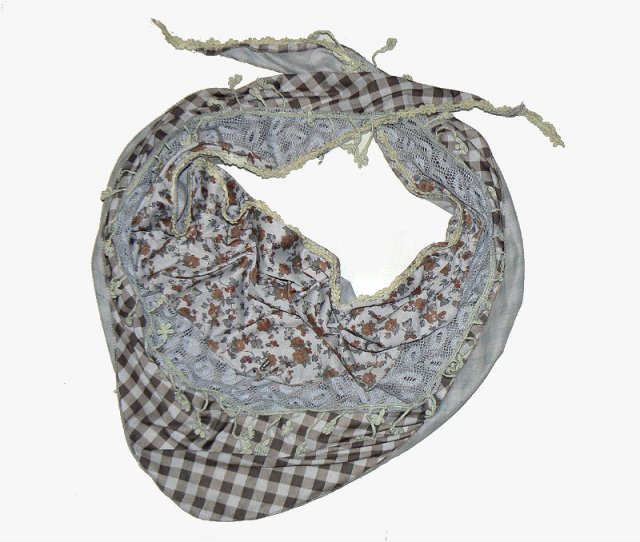 Trójkątna bawełniana chusta z połączenia dwóch tkanin i koronki, w pastelowych stonowanych kolorach. Materiały zakładane jeden na drugi.