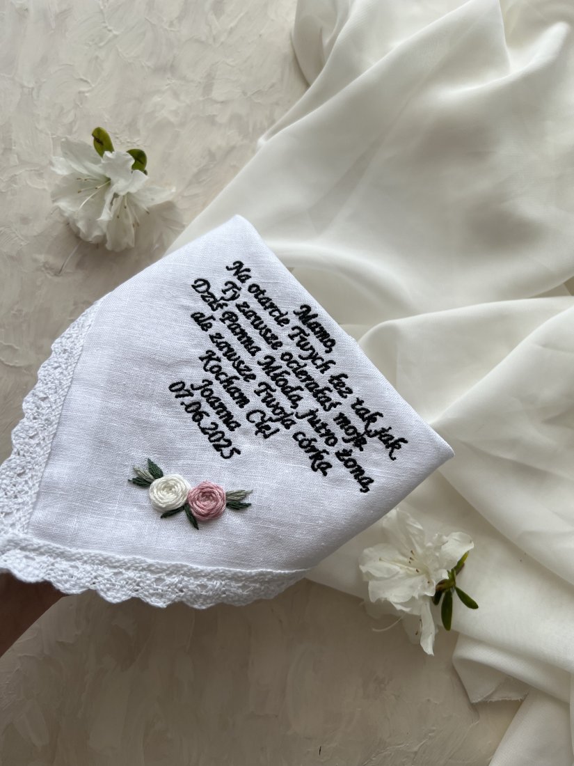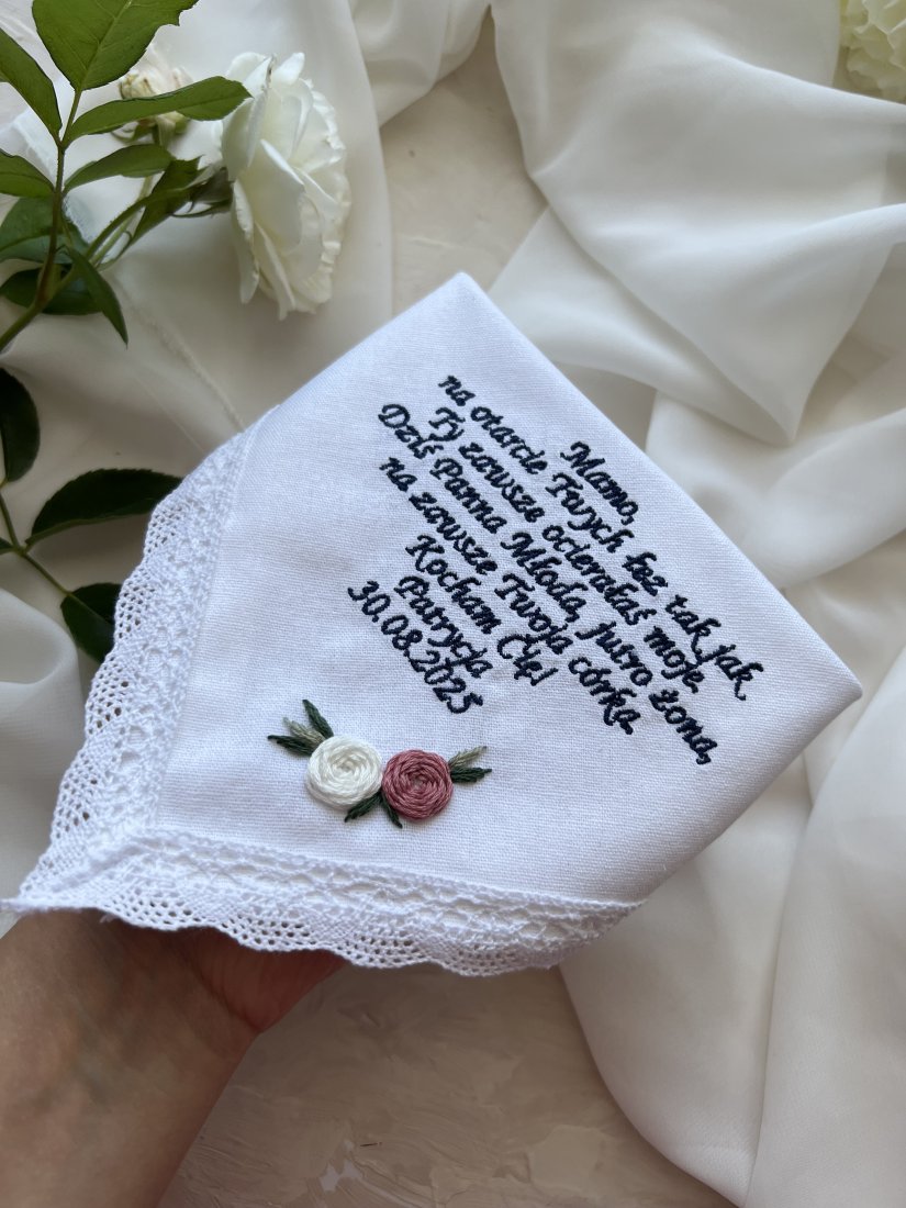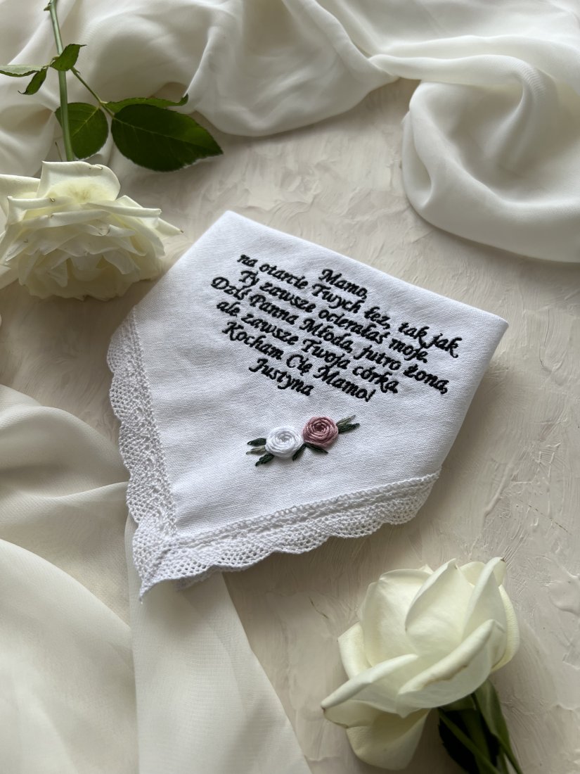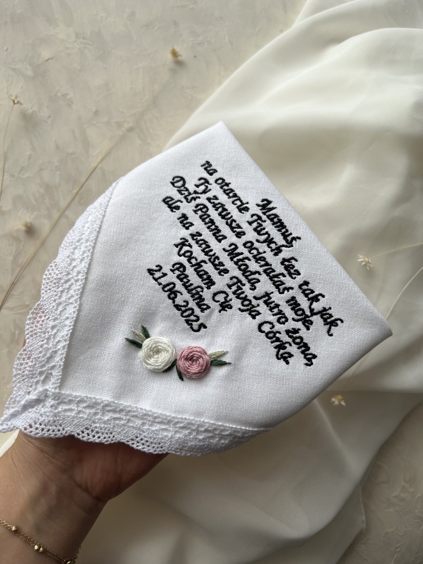 Elegancka chusteczka haftowana to subtelny, a zarazem niezwykle osobisty upominek dla Mamy w dniu ślubu. Wykonana z miękkiej, wysokiej jakości tkaniny, ozdobiona precyzyjnym haftem według Twojego własnego tekstu, staje się pamiątką pełną emocji i wdzięczności.