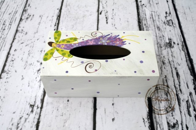 Ręcznie malowane farbami akrylowymi (ekologicznymi), odpornymi na wodę drewniane pudełko na chusteczki. Pudełko otwiera się od spodu co umożliwia włożenie opakowania z chusteczkami.