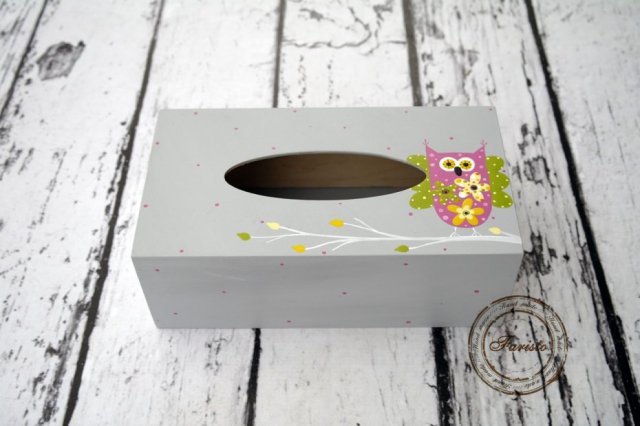 Ręcznie malowane farbami akrylowymi (ekologicznymi), odpornymi na wodę drewniane pudełko na chusteczki. Pudełko otwiera się od spodu co umożliwia włożenie opakowania z chusteczkami.