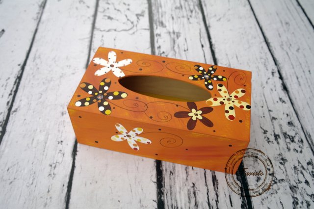 Ręcznie malowane farbami akrylowymi (ekologicznymi), odpornymi na wodę drewniane pudełko na chusteczki. Pudełko otwiera się od spodu co umożliwia włożenie opakowania z chusteczkami.