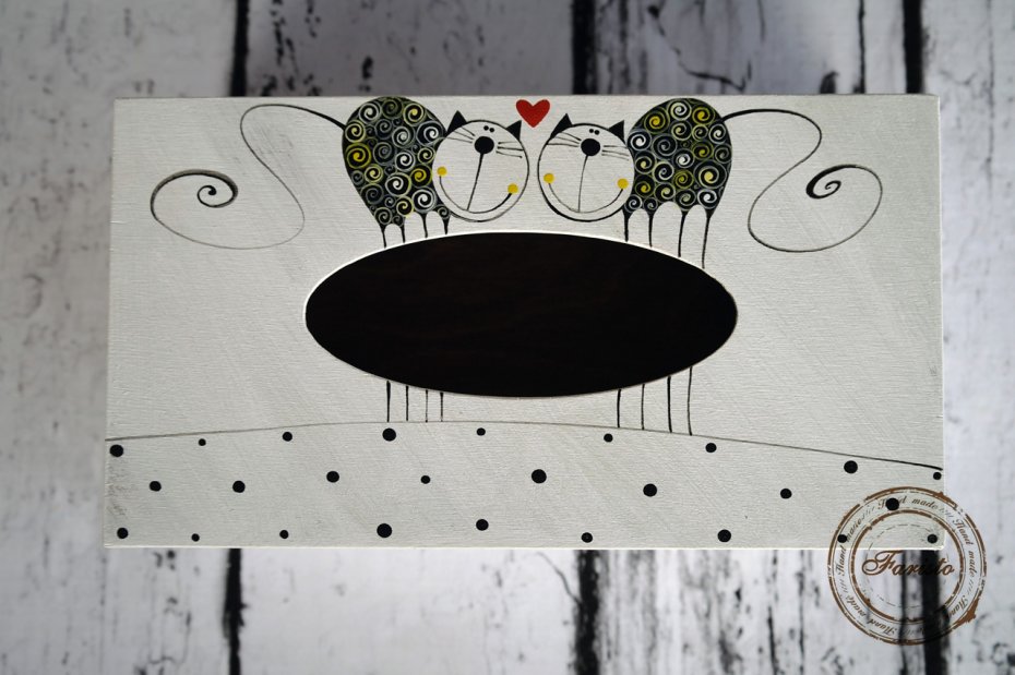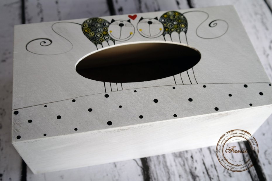 Ręcznie malowane farbami akrylowymi (ekologicznymi), odpornymi na wodę drewniane pudełko na chusteczki. Pudełko otwiera się od spodu co umożliwia włożenie opakowania z chusteczkami.