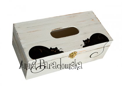 Drewniane pudełko na chusteczki, ręcznie malowane farbami akrylowymi, zabezpieczone lakierem półmatowym. Pudełko otwierane od dołu. Tło: ecru.
