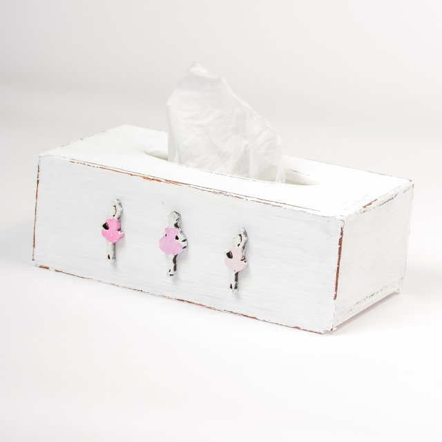 Pudełko na chusteczki wykonane z drewna sosnowego, ręcznie malowane, ozdobione motywem roztańczonych baletnic. Od spodu pudełko zabezpieczone wysuwanym denkiem zapobiegającym wypadaniu zawartości podczas przenoszenia, umożliwiającym zapakowanie chusteczek.