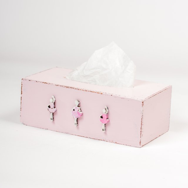 Pudełko na chusteczki wykonane z drewna sosnowego, ręcznie malowane, ozdobione motywem roztańczonych baletnic. Od spodu pudełko zabezpieczone wysuwanym denkiem zapobiegającym wypadaniu zawartości podczas przenoszenia, umożliwiającym zapakowanie chusteczek.