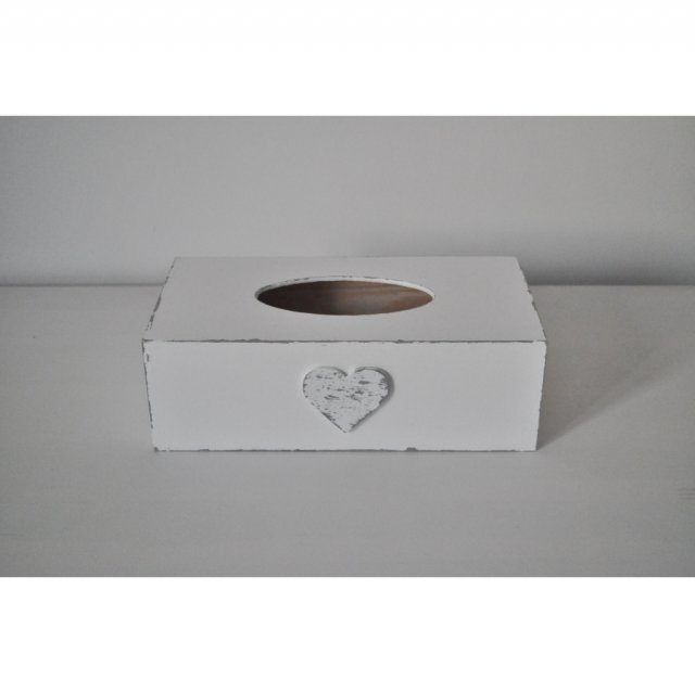 Chustecznik został pomalowany na biało farbą akrylową,i przetarty na krawędziach, przetarcia są w kolorze szarym.Ozdobiony jest przetartym serduszkiem wyciętym z drewnianej sklejki.