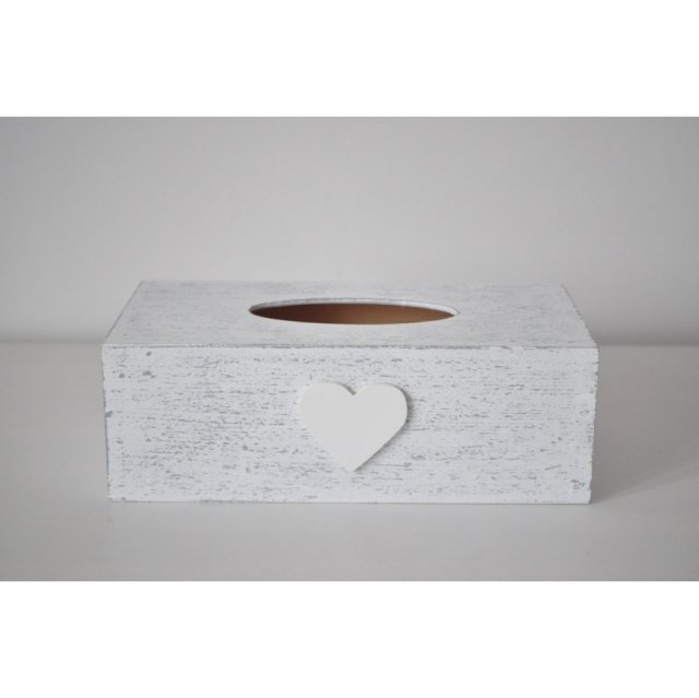 Chustecznik został pomalowany na biało szaro farbą akrylową,i przetarty.Ozdobiony jest białym serduszkiem wyciętym z drewnianej sklejki.