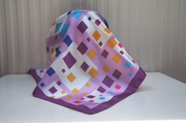 Radosna chustka w kolorowe kwadraciki. Miła w dotyku, ładnie się układa. Stan bardzo dobry.
