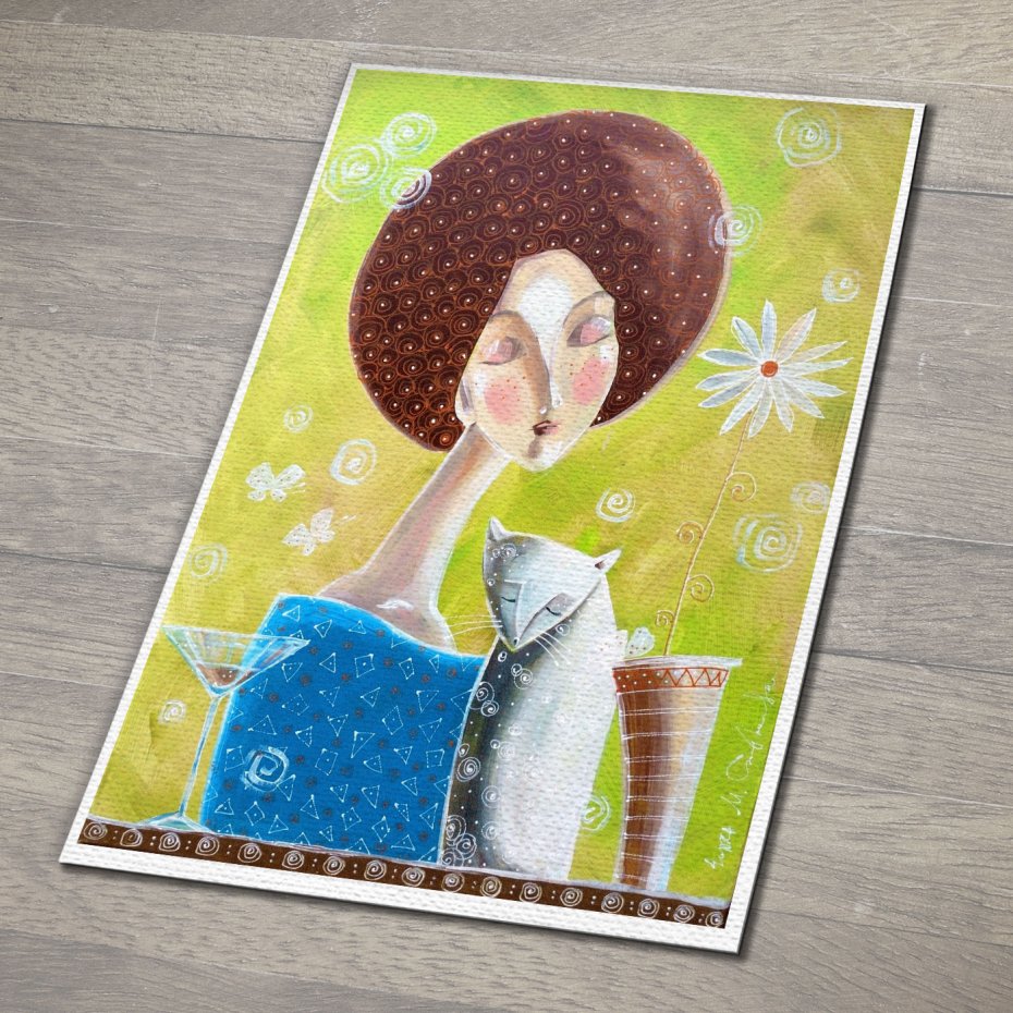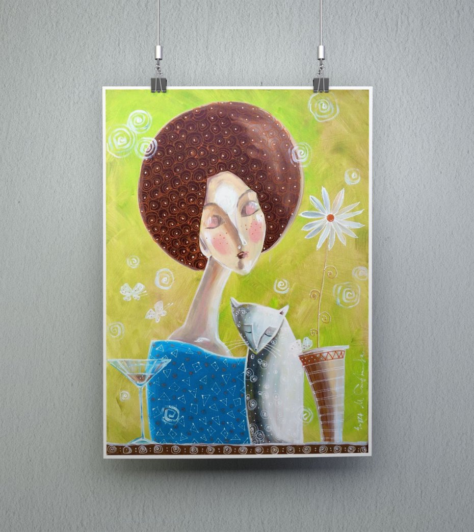 Reprodukcja obrazu własnego autorstwa zatytułowanego "Chwila spokojnej melancholii", wydrukowana na wysokiej jakości satynowanym papierze o gramaturze 200-220 g/m² w technologii druku pigmentowego, która to technologia zapewnia doskonałe odwzorowanie kolorów oraz trwałość i odporność na promieniowanie UV. Ostatnie zdjęcie przedstawia wydruk w formacie A4 oprawiony w drewnianą ramę z białym passe-partout. Wymiar zewnętrzny ramy: 30x40 cm.