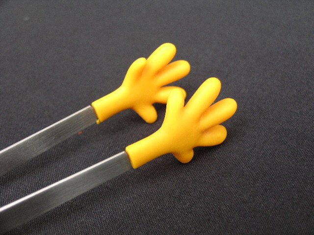 Prześmieszny sztuciec do cukrowych kostek lub drobnych słodkości lub... po prostu według uznania :) Chromowany metal i gumowe, elastyczne łapki w kolorze jajecznej żółci. 13,5 x 3 cm. Stan zachowania bardzo dobry.