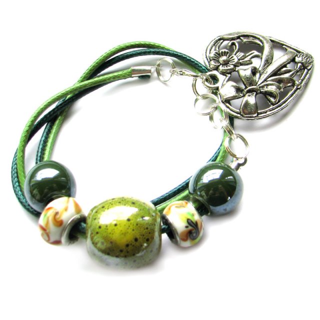 Bransoletka wykonana z zielonego i seledynowego woskowanego sznurka bardzo dobrej jakości, korali ceramicznych, korali typu pandora oraz dowieszki serca. Do 2-krotnego owinięcia wokół nadgarstka. Długość 38 cm, pasuje na nadgarstek 16-18 cm. Zapięcie typu karabińczyk.