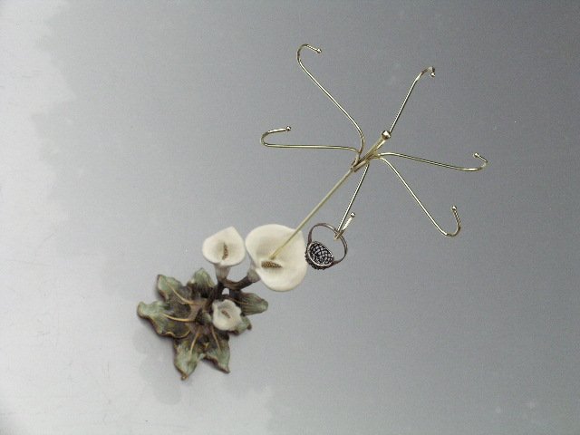 Wielce ciekawa rzecz. Metalowy Stojak - użytkowa ozdoba - na biżuterię. Podstawa emaliowane kwiaty i 6 drucianych wieszczów na sztycy. Emalia doskonale wykonana i stonowanych barwach i różne odcienie metalu.