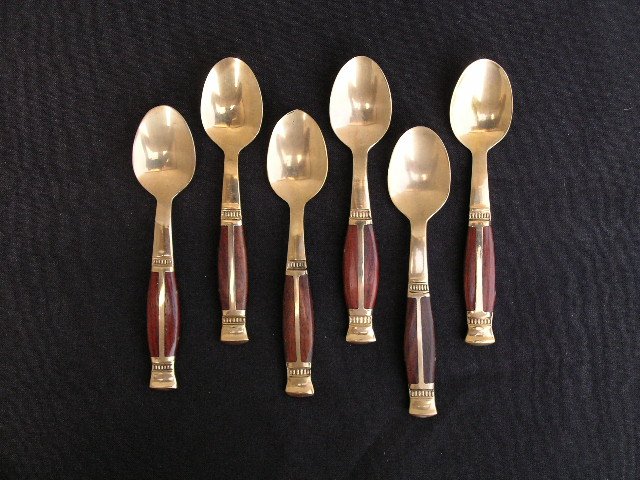 Komplet sześciu łyżeczek - oryginalne połączenie mosiądzowatego metalu z drewnem egzotycznym. Delikatny grawerunek ozdobny. 12 x 2,5 cm. Nie używane. Stan zachowania bardzo dobry.