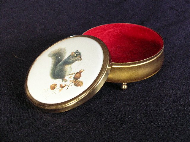 Metalowe puzderko średniego rozmiaru, metalowe, z czerwonym wyściełaniem od wewnątrz, na uroczych kulko-stópkach i z ciekawym, przemiłym wiewiórkowo-jesiennym zdobieniem pod ochronną warstwą przezroczystego plastiku. Porządnie wykonane. Niespotykane. Lekkie. 7,5 x 3,5 cm. Stan zachowania dobry plus.