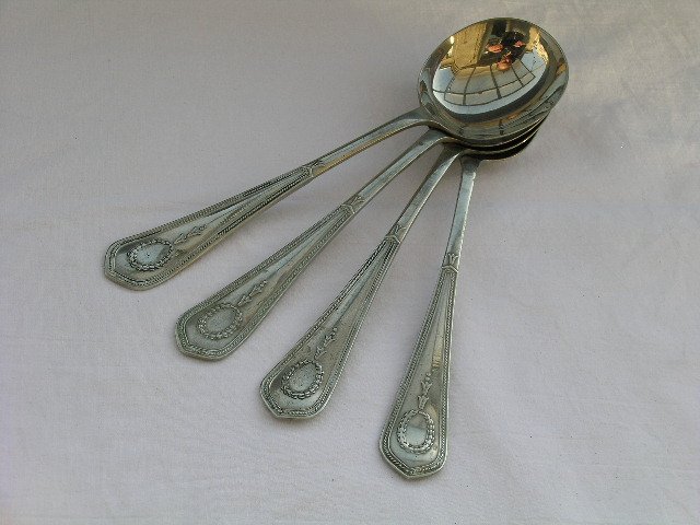 Cztery metalowe łyżki - sygnowane numerycznie 695320, z nierdzewnego platerowanego niklu. Ciekawy kształt - świetne do sałatek, lub do nakładania potraw z większych naczyń. Piękne klasyczne zdobienie w pałacowym, wysmakowanym stylu. 19,5 x 5 cm. Do doczyszczenia; niektóre zmatowiałe upływem czasu. Dawnej daty, niespotykane.