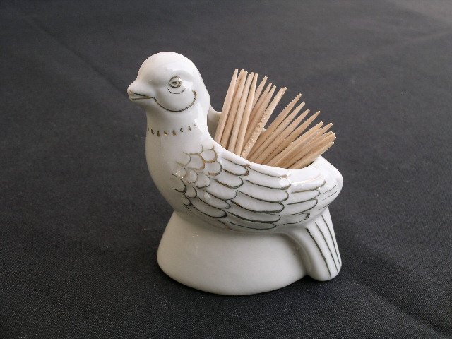 Niespotykana porcelanowa figurka - naczynie na wykałaczki. Ładnie wykonany, fakturowy, z ręcznie malowanymi złoceniami. Ozdobą stołu na pewno być może, ale i w łazience, np. na drobiazgi kosmetyczne poetycko i przyjemnie się przysłuży :) 7 x 4 x 7,5 cm. Stan zachowania bardzo dobry.