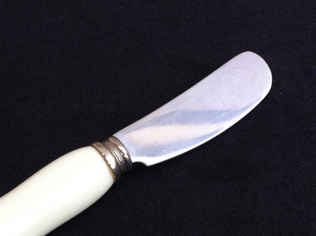 Nożyk w ciekawym kształcie, do masła, serka topionego, z ceramiczną, przyjemnie jedwabistą rączką. 13,5 x 2 cm. Stan zachowania dobry.