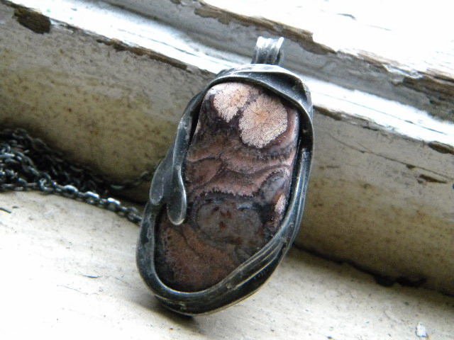 Naszyjnik. jaspis w ocynowanej miedzi.Kamień oprawiony jest tak, by wisior mógł być dwustronny. wisior o wymiarach 4,8 x 2, x 1,8cm. łańcuszek z posrebrzanej,oksydowanej miedzi z zapięciem z oksydowango srebra 925. Długość łańcuszka 92cm