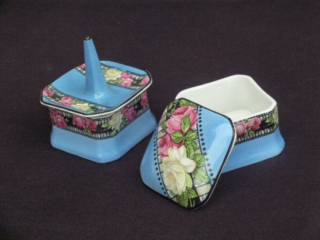 Lekki, ceramiczny zestaw łazienkowy na kosmetyczne drobiazgi, waciki, biżuterię. Z dwóch pojemniczków się składa, a przykrywka jednego to zarazem oddzielnie funkcjonujący stojaczek na pierścionki. Dawnych lat wspomnienie, bo przedmiot to nie nowy, w ciekawej stylistyce i intrygującym zdobieniu, jakby z klasą i dumą swej różanej tradycji chciał w nowoczesność wkroczyć :) Nie sygnowany. Pojemnik z przykrywką zwykłą po narożnym przejściu, bo nadpęknięty i w podstawie, i w przykrywce... ale nadal praktyczny, ino z celebracyjną delikatnością ... Sama malatura oraz dwa pozostałe elementy w stanie dobrym plus.Podstawy 7,5 x 7,5; wysokości 6 i 9 cm. Bardzo ciekawe i wnętrze upiększające. Zestaw, chociaż po przejściach - tak ciekawy i przykuwający uwagę, dawnej daty i intrygująco szlachetnie zaprojektowany, że wart ocalenia, udbania i nowego życia :)