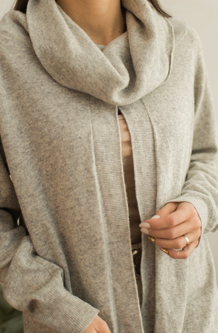 Szary, ciekawy sweter z wycięciem i opadającym kołnierzem.
