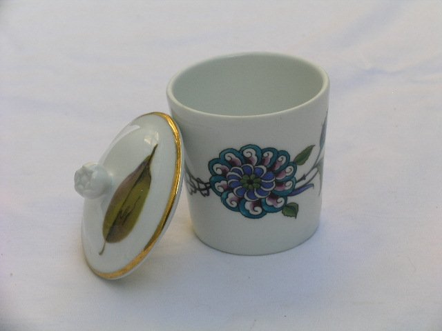 Kuchenne, ale może też jako łazienkowe służyć, ciekawie zestawione naczynko z przykrywką. Szlachetna porcelana od Royal Worcester. Przykrywka chyba od innego naczynka, ale razem wyglądają przyjemnie :) Błyszczące szkliwienie i ciekawy wzór. Dół 5; góra 6; wys.6 i 8,5 cm. Stan zachowania bardzo dobry.