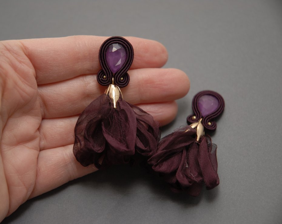 oferuję kolczyki zrobione techniką sutasz, ozdobione fasetowanym kaboszonem i kwiatkami z materiału