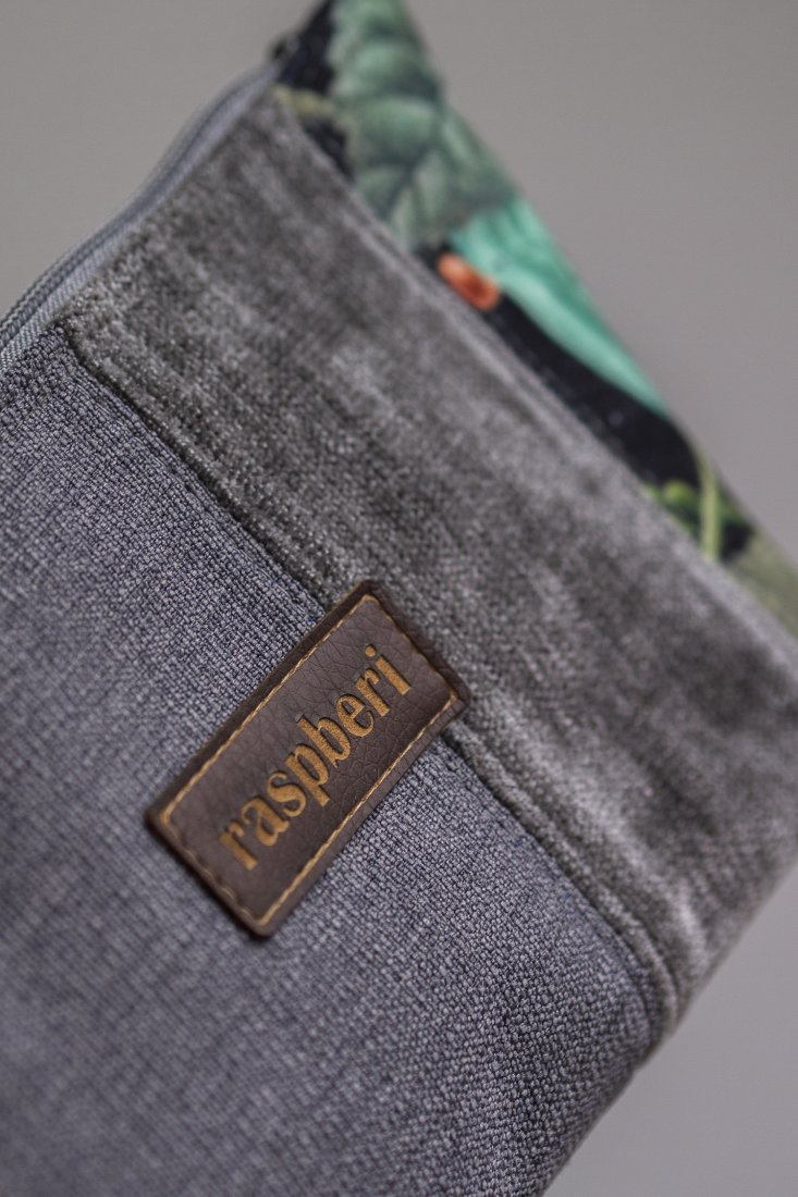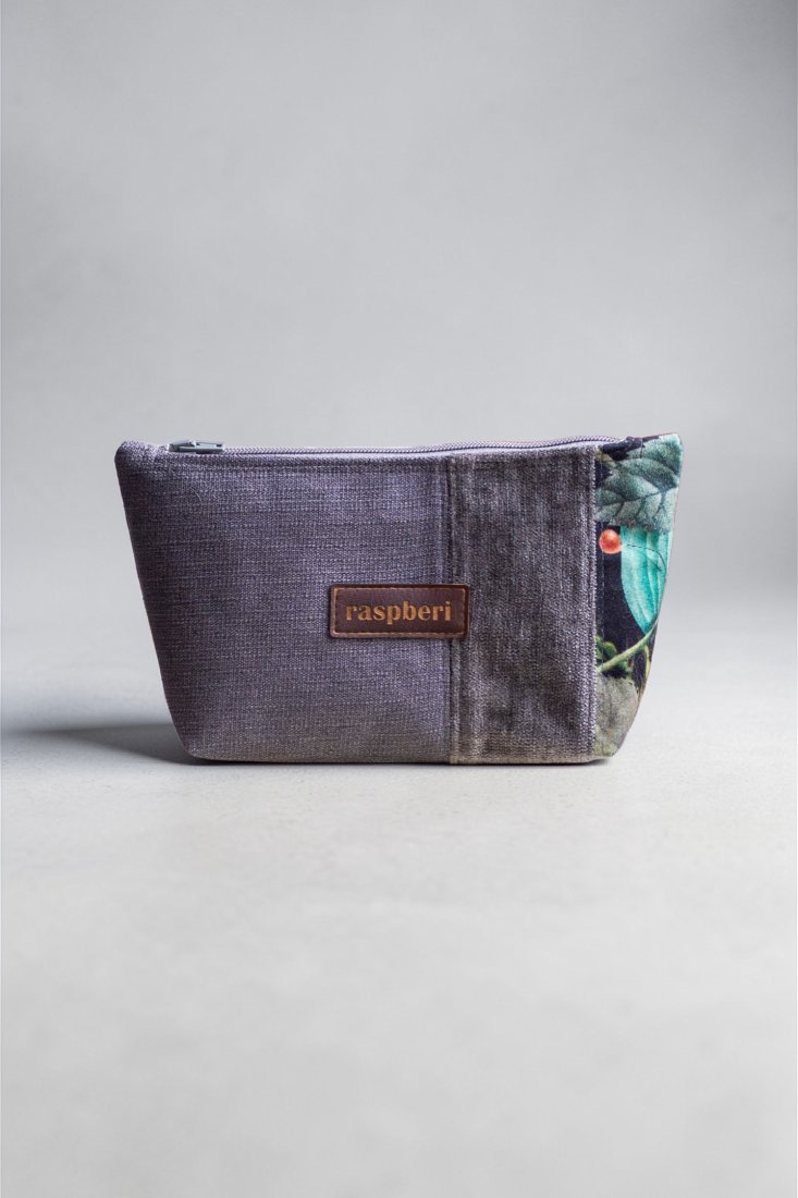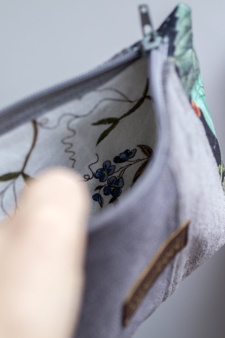 Średniej wielkości kosmetyczka wykonana kilku rodzajów tkanin. Stworzona w duchu no waste.