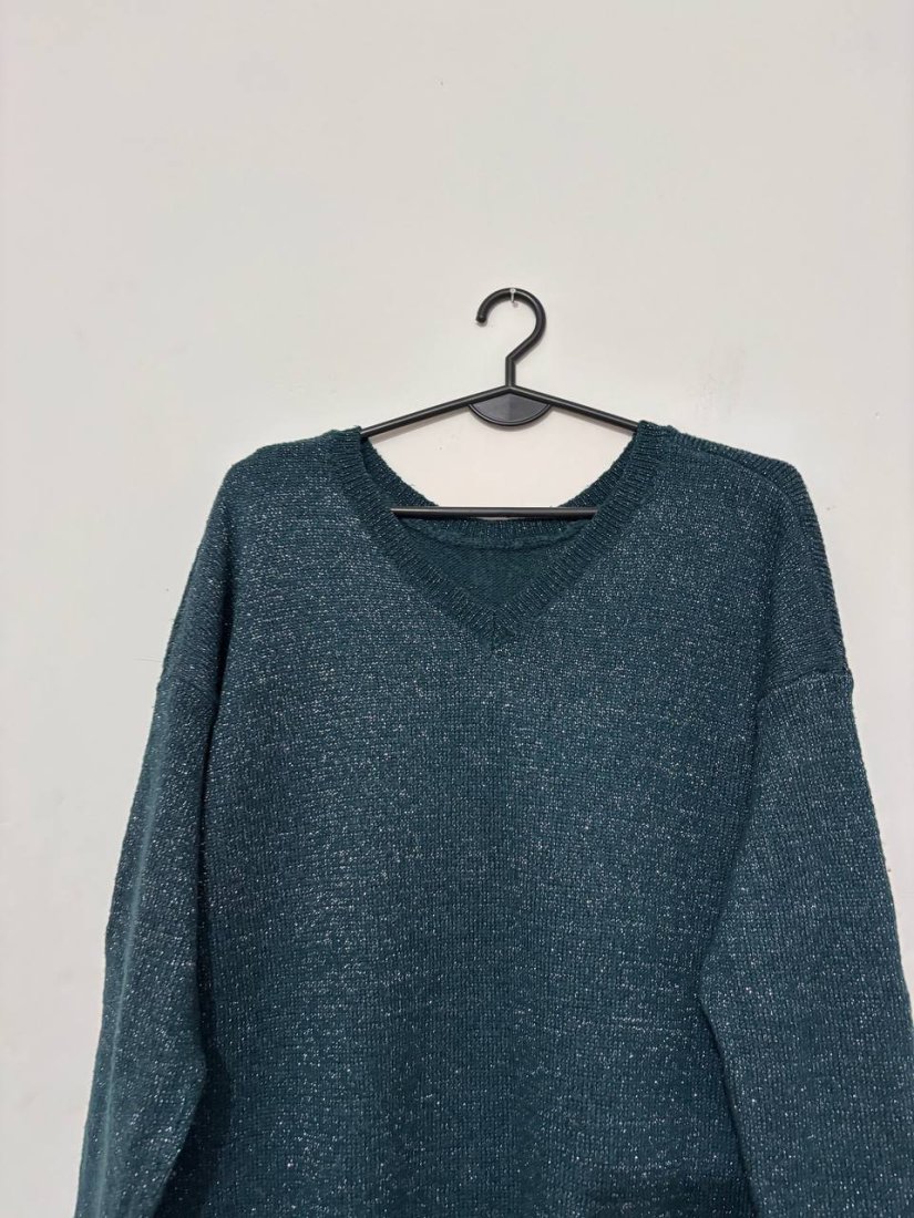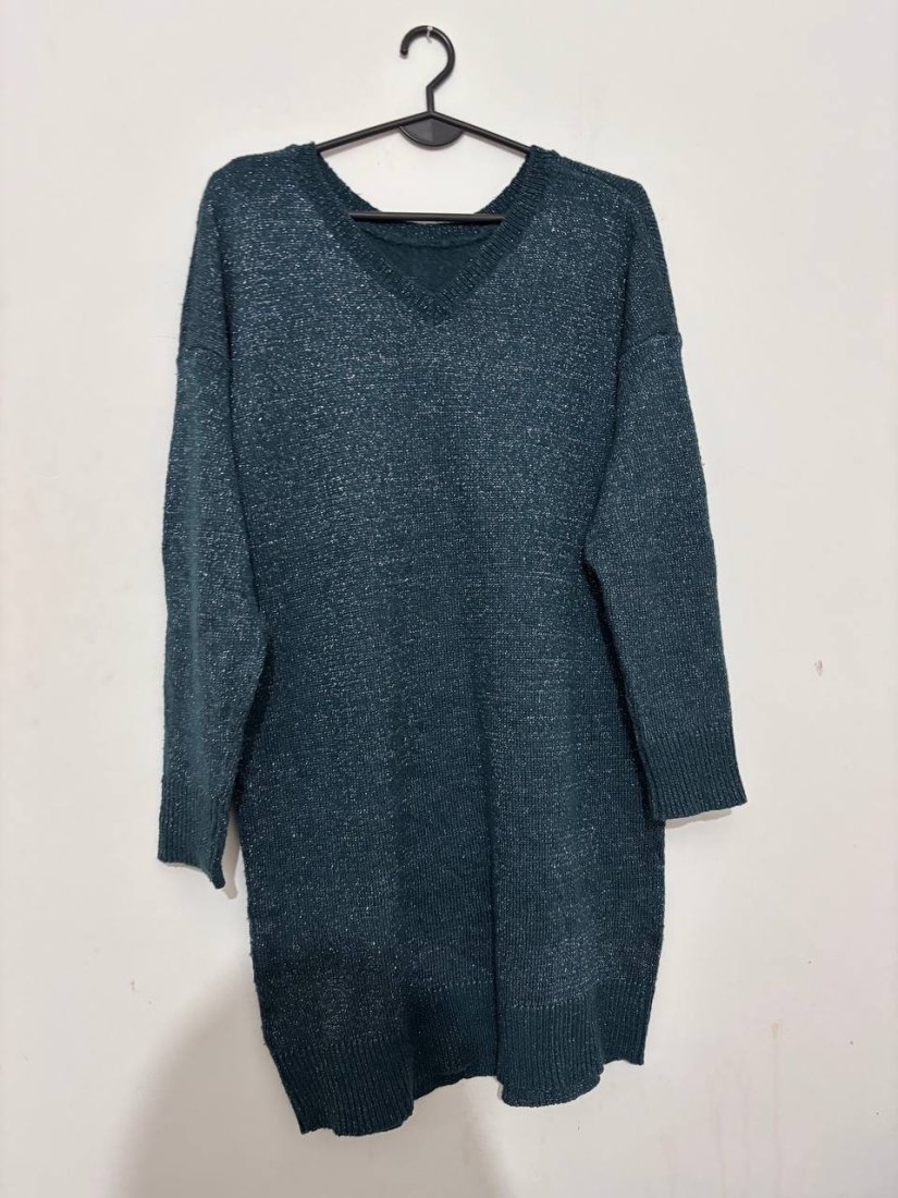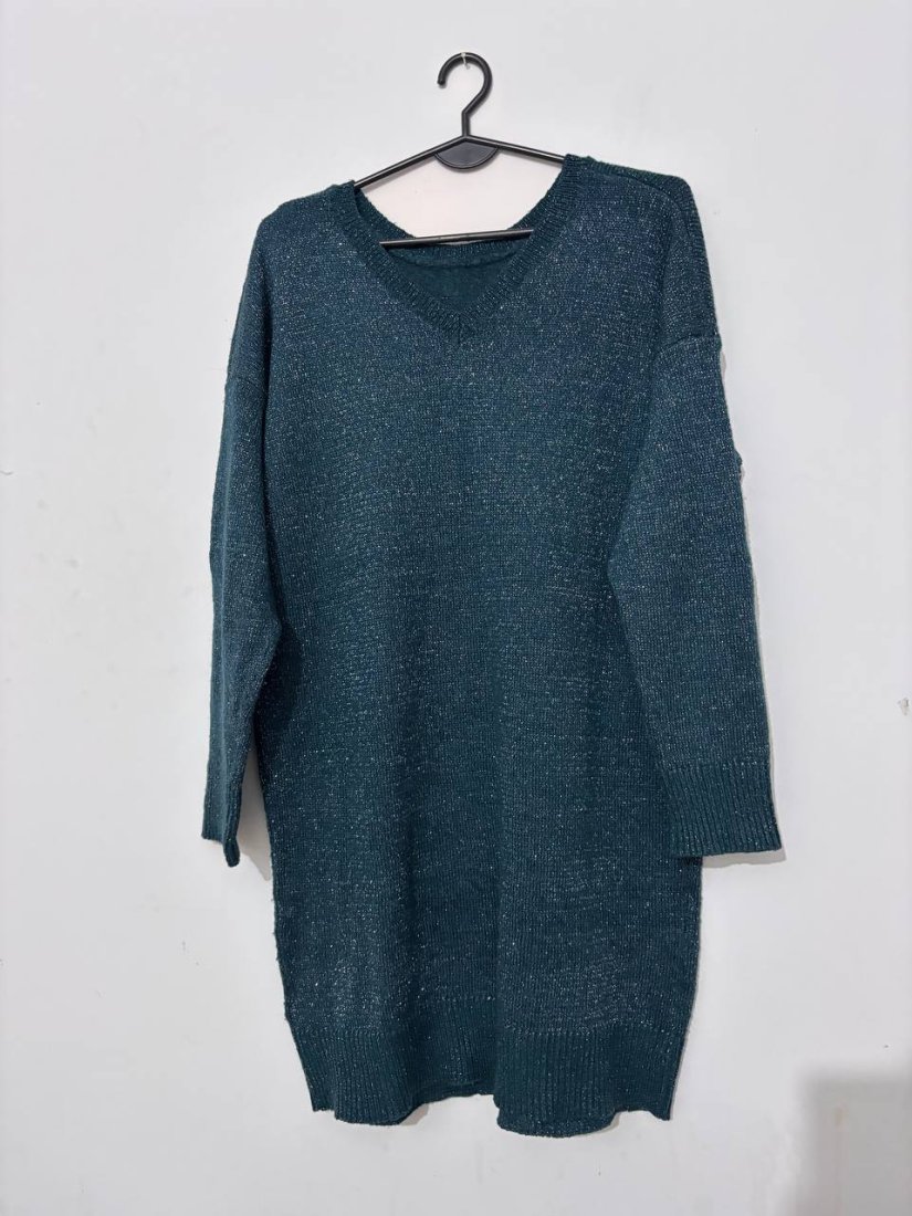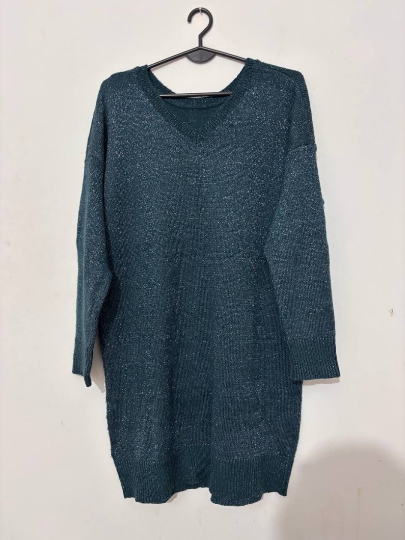 Elegancka, ciemnozielona sukienka swetrowa z delikatnym połyskiem. Miękka, elastyczna i bardzo wygodna w noszeniu. Posiada klasyczny dekolt w kształcie litery V oraz luźniejszy krój, który pięknie układa się na sylwetce. Idealna na jesień i zimę – do kozaków, botków lub jako tunika do legginsów.