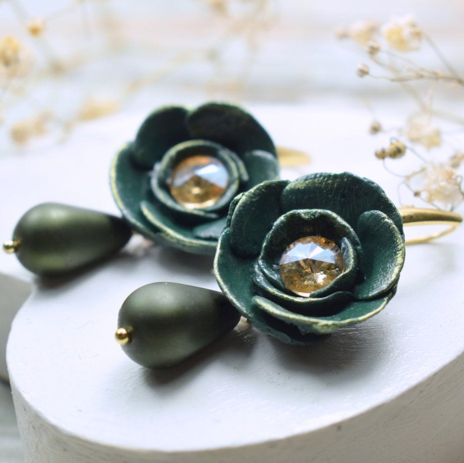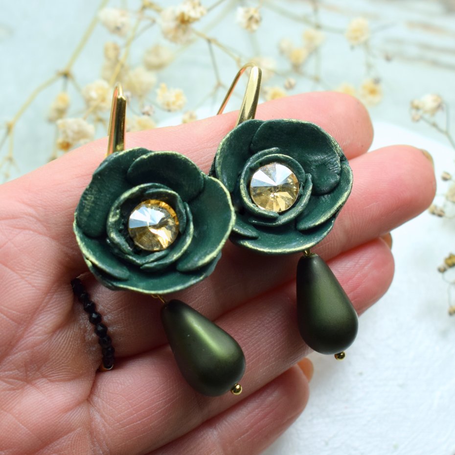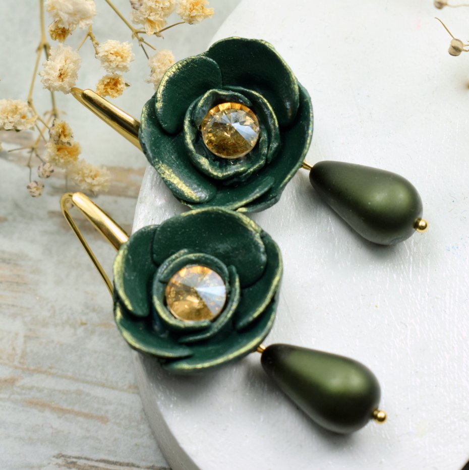 Eleganckie i wyjątkowe ciemnozielone kolczyki kwiaty, ręcznie wykonane z najwyższej jakości glinki polimerowej. Odcień zieleni zbliżony jest do bardzo ciemnej oliwki.