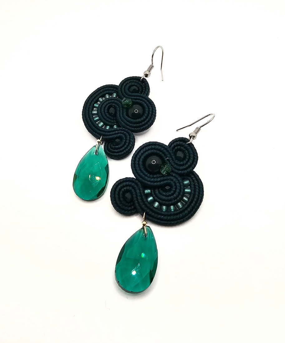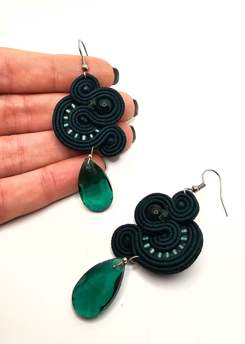 Ciemnozielone kulki jadeitu otoczone polskimi sznurkami sutasz oraz szklanymi czeskimi i japońskimi koralikami o rożnych kształtach i wielkościach. Dół kolczyków zdobią szklane fasetowane kryształki w kształcie migdała. Kolczyki zawieszone na klasycznych otwartych biglach ze stali chirurgicznej w kolorze ciemnego srebra.