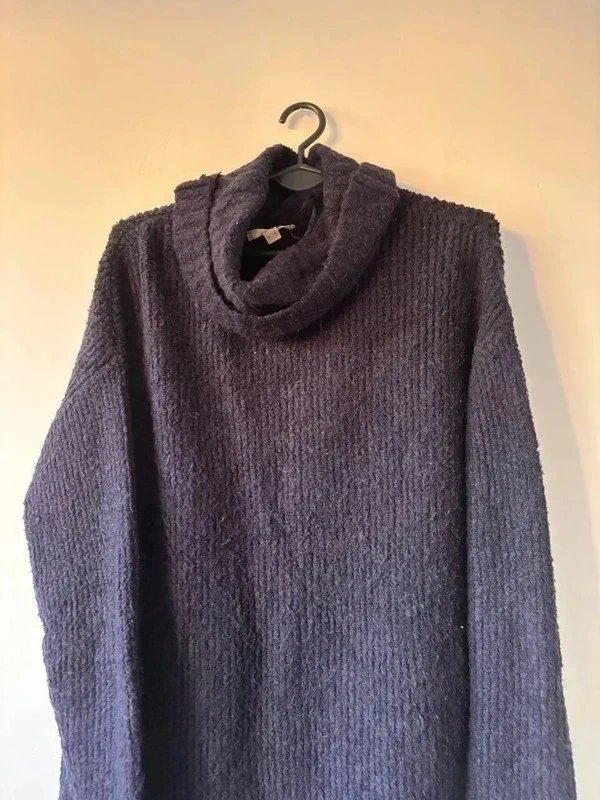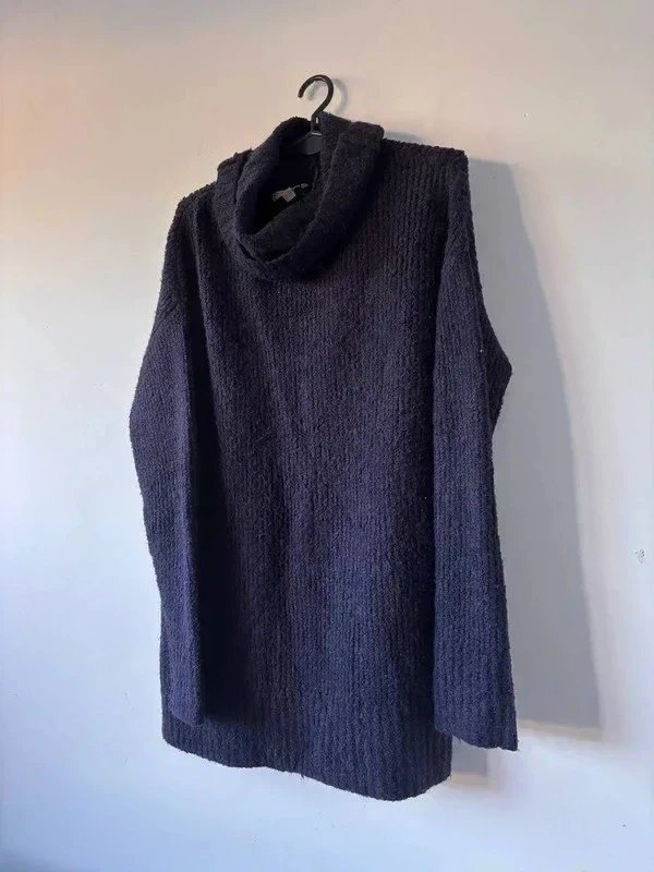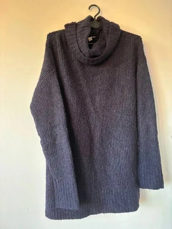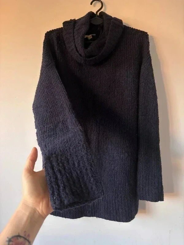 Wyjątkowy, gruby sweter/tunika w głębokim, ciemnofioletowym odcieniu (wpadający w granat/czarny), z lekko puszystą, prążkowaną fakturą. Ma ciepły, duży golf (turtleneck). Fason jest luźny (oversize) i wygodny, a długie rękawy zapewniają komfort.