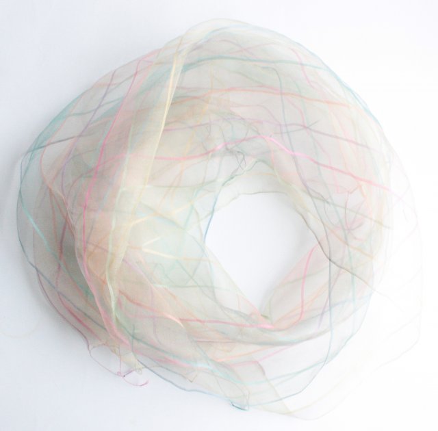 Zwiewny, transparentny, cieniowany szal typu mgiełka wykończony delikatnymi frędzlami.