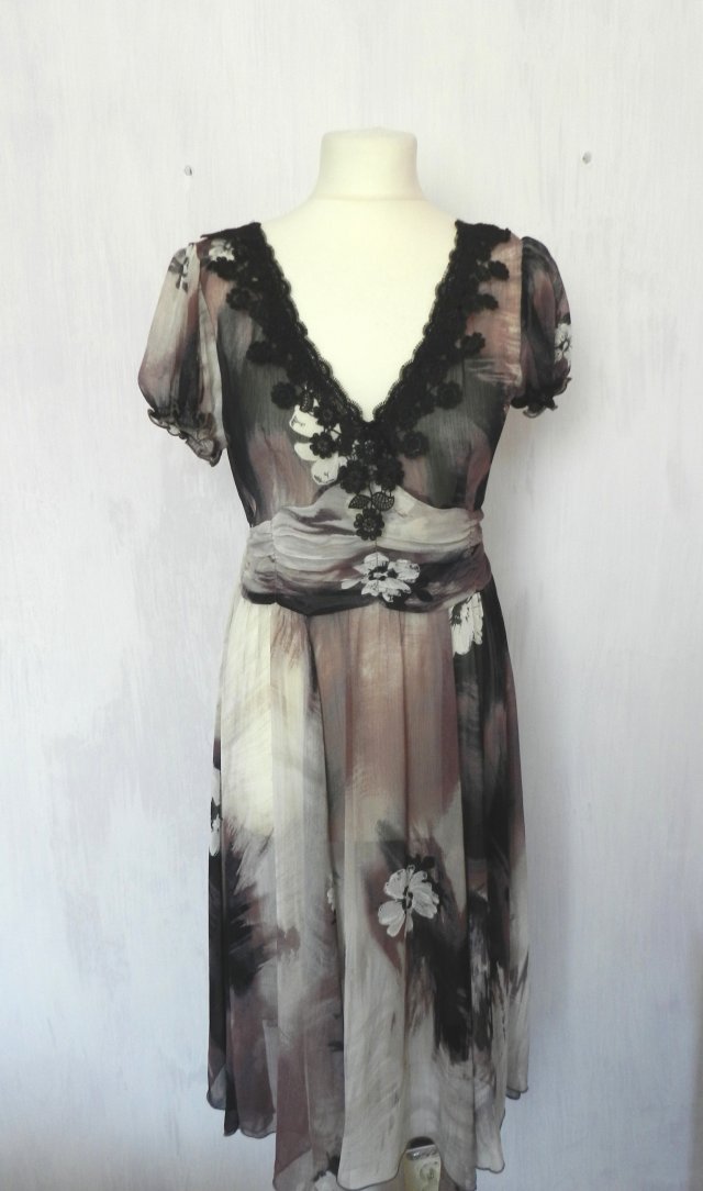 Sukienka z dekoltem w serek wykończonym czarną koronką.