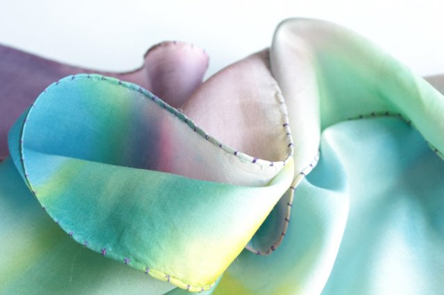 Pastelowy, cieniowany szal z pięknym ręcznym obszyciem. Materiał to prawdopodobnie jedwab lub wiskoza.