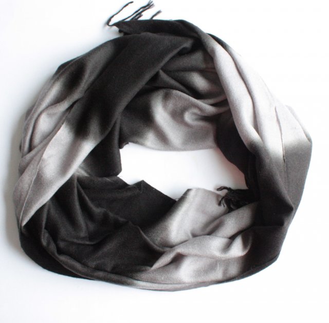 Miękki, duży szal w przelewanych odcieniach czerni i szarości.