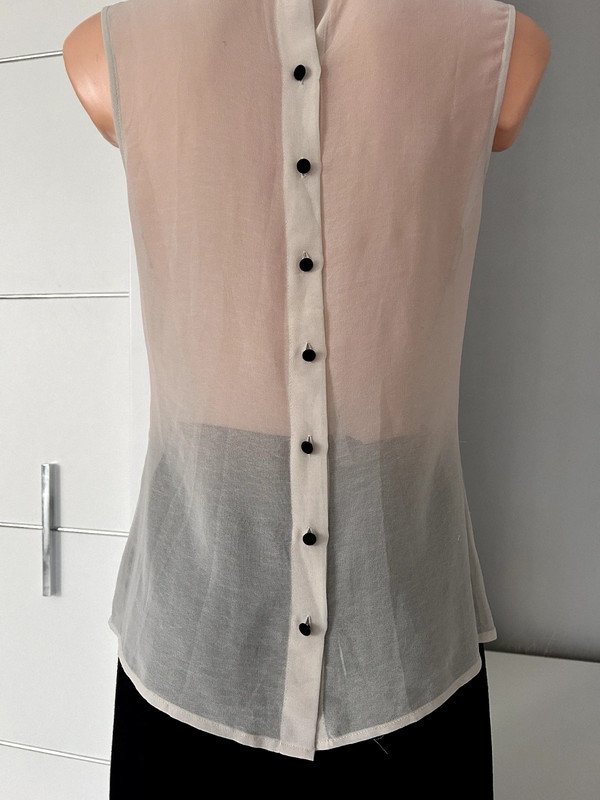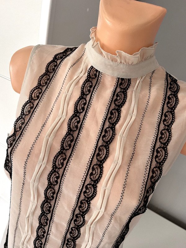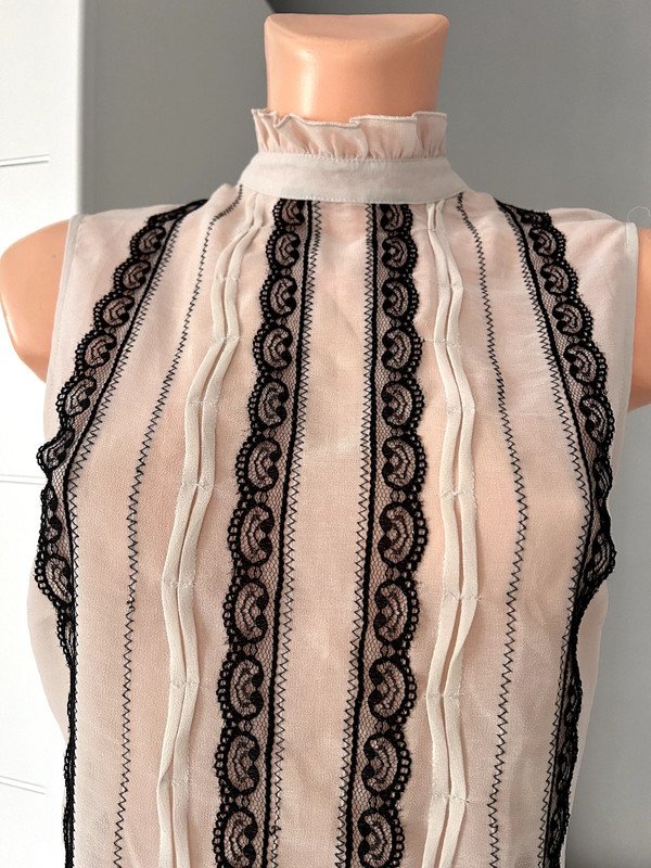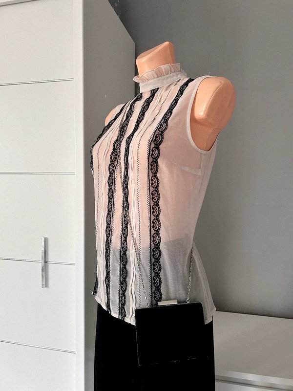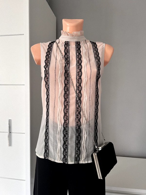 Klasyczna, półprzeźroczysta, beżowa bluzeczka bez rękawów na stójce z ozdobną falbanką. Z przodu zdobiona czarną koronką. Z tyłu zapinana na czarne guziki. Bardzo kobiecy fason, idealna pod marynarkę do pracy, na imprezę. Nie posiada metki ale moim zdaniem to rozmiar xs, s.