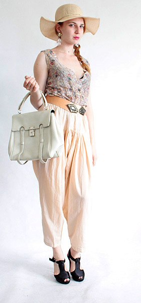 Swobodne, obszerne spodnie wykonane prawdopodobnie z bawelny. Idealne na ciepłe letnie dni.