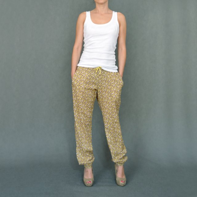 Cieniutkie, bawełniane spodnie od H&M. Ze ściągaczami na dole i wiązane w talii. Po bokach kieszonki. Tło to jasny brąz, kwiatuszki jasno żółte. Polecam.