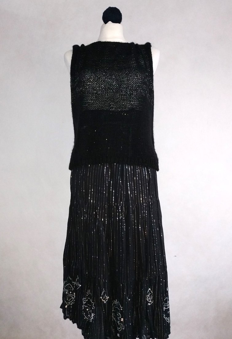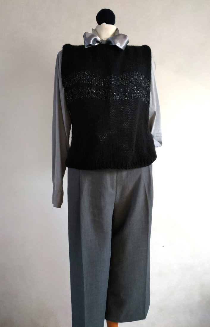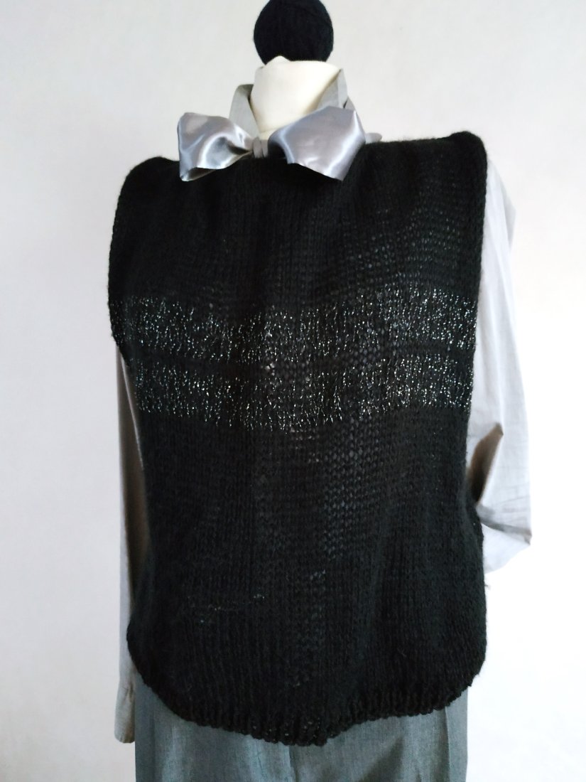 prosta, czarna z wplecioną na przodzie srebrną nitką. cienka włóczka z delikatnym moherowym włosem, bardzo przyjemna. dobra do biurowych zestawów , ale też do kreacji wyjściowych :-)