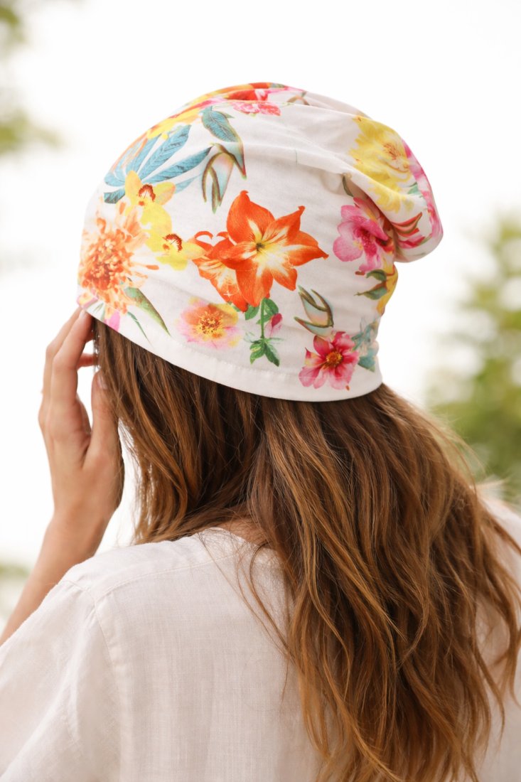 Delikatny kwiatowy deseń dodaje charakteru i sprawia, że czapka jest modnym dodatkiem do codziennych stylizacji – zarówno wakacyjnych, jak i miejskich.