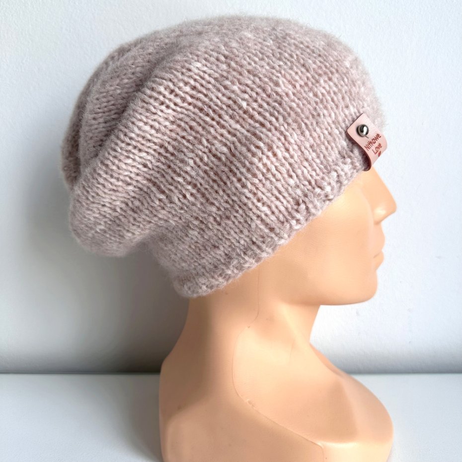 Czapka handmade jest ozdobiona metką Nitkowe Love ze skóry ekologicznej, którą można łatwo odpiąć do prania.