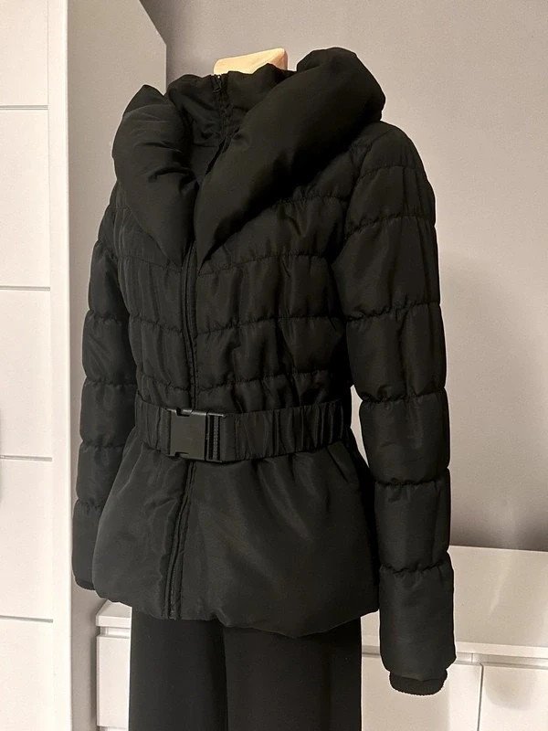 Czarna pikowana kurtka z elastycznym paskiem firmy Trend One r.M. Bardzo ciepła, wokół szyi gruby ozdobny kołnierz I stójka. Zapinana na zamek, przy rękawach ściągacze, ładnie dopasowana. Bardzo wygodna. Polecam