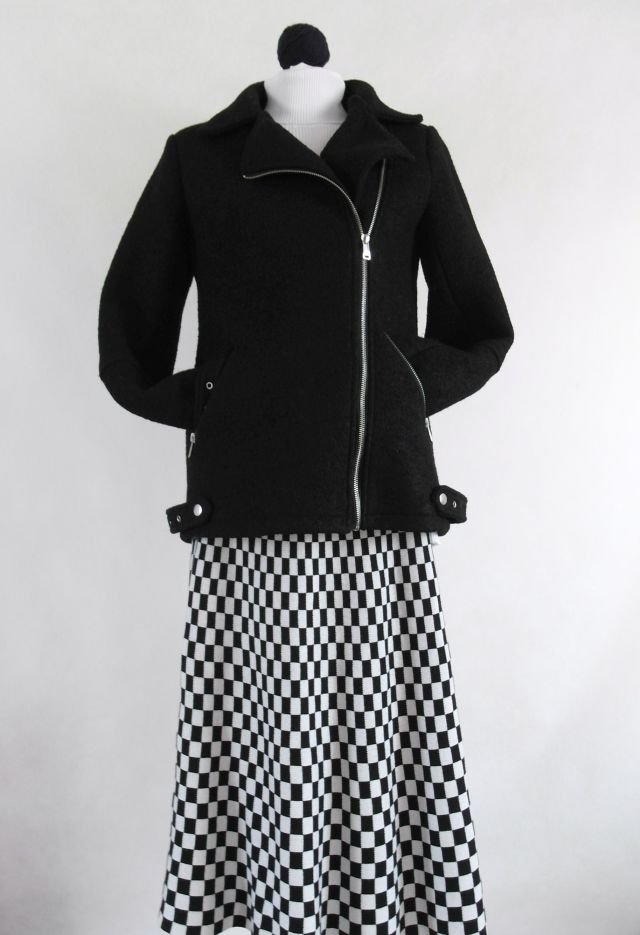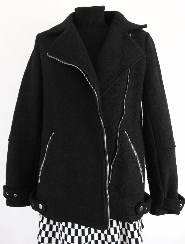 fason prosty, klasycznej ramoneski z suwakiem bliżej jednego boku.materiał w rodzaju "koca", jest dosyć ciepła, nawet łagodniejszą zimą daje radę.