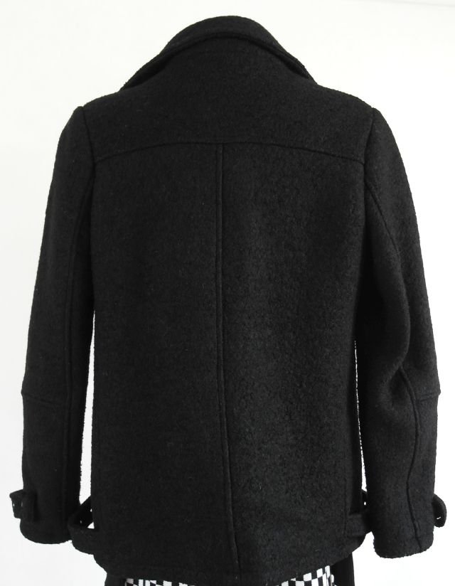 fason prosty, klasycznej ramoneski z suwakiem bliżej jednego boku.materiał w rodzaju "koca", jest dosyć ciepła, nawet łagodniejszą zimą daje radę.